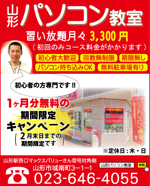 さて山形パソコン教室では2月末日までのご入会手続きを頂いた方は1か月分の会費がサービスとなります。